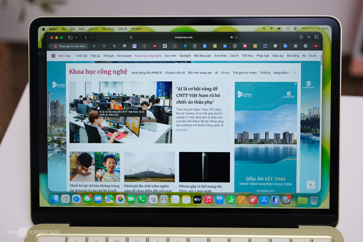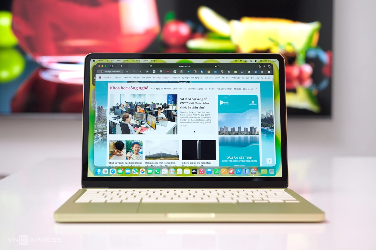 Điểm người dùng nghi ngại lớn nhất trên Neo là bộ nhớ RAM 8 GB, không thể lựa chọn nhiều hơn và cũng không thể nâng cấp sau này. Con số 8 GB không còn hợp thời ở năm 2026 nhưng với hệ điều hành được tối ưu tốt như macOS, trải nghiệm sử dụng thực tế đem đến những bất ngờ. Với tác vụ đơn giản như lướt web, xem video, chỉnh sửa ảnh thông thường, chuyển đổi nhanh giữa các ứng dụng, máy không gặp bất kỳ hiện tượng giật lag nào. Thử nghiệm mở cùng lúc gần 30 tab trên Safari, trong đó có hai tab YouTube, TikTok mở video độ nét cao, máy vẫn chạy mượt.