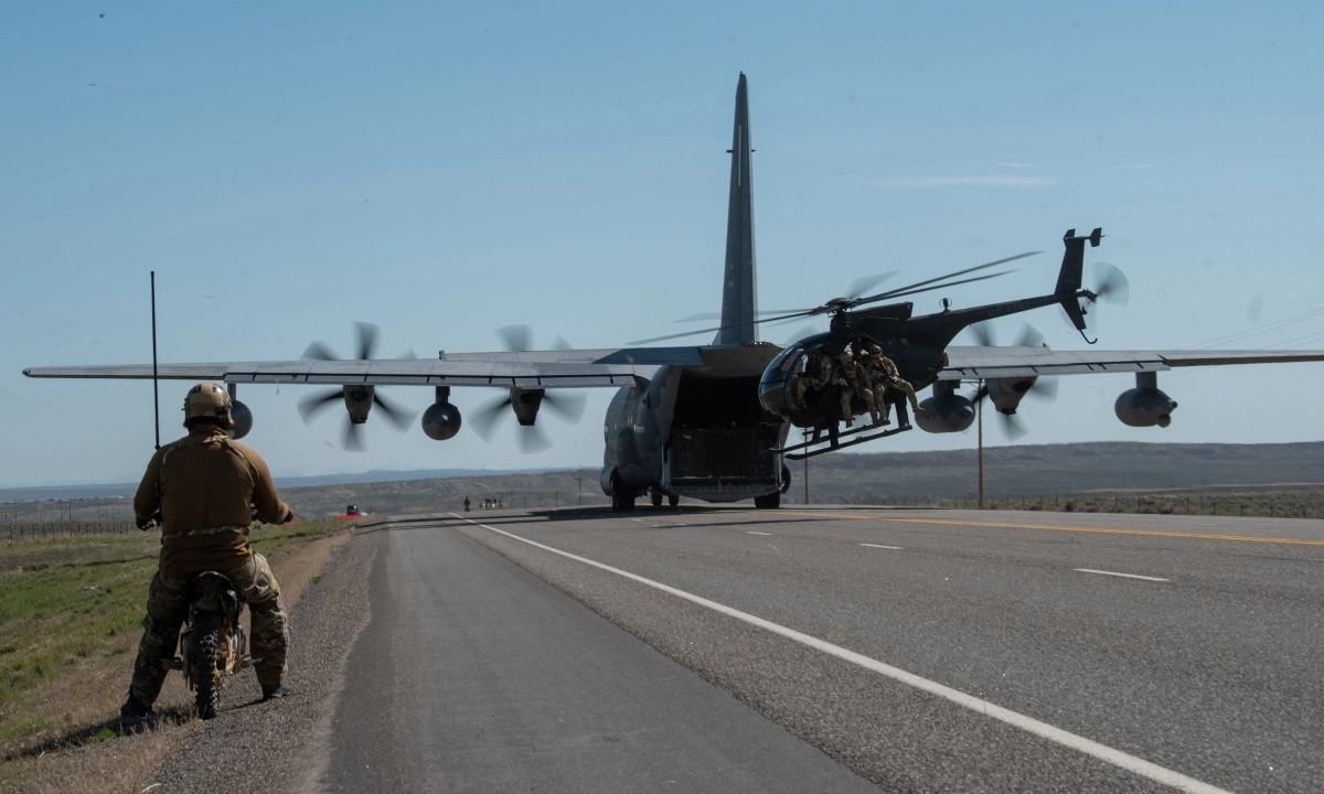 Trực thăng MH-6M và vận tải cơ MC-130J diễn tập tìm kiếm cứu hộ ở bang Wyoming, Mỹ, hồi năm 2023.