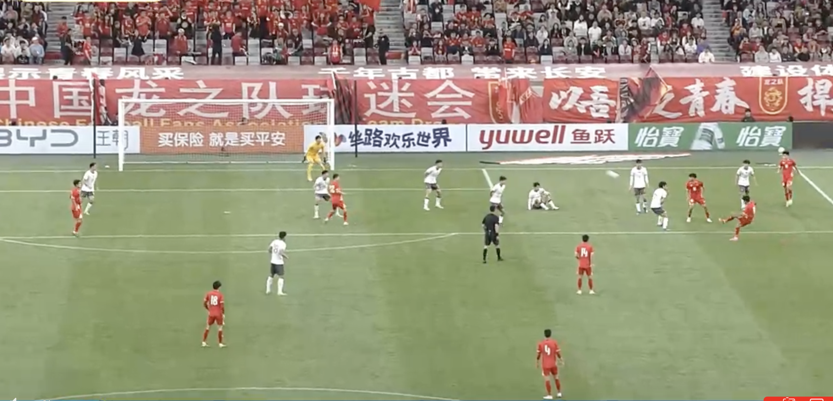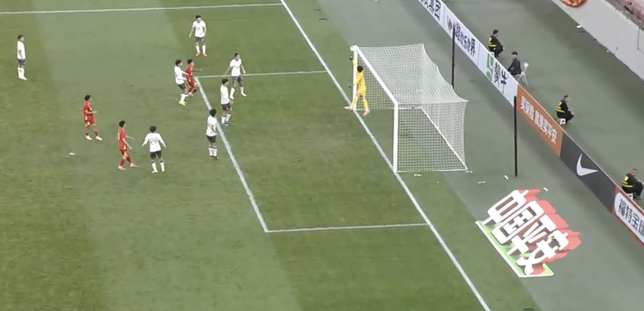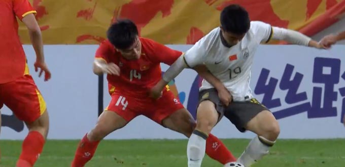 17'Cao Văn Bình vừa có pha cứu thua bằng chân sau pha tổ chức đá phạt bên cánh phải của Trung Quốc