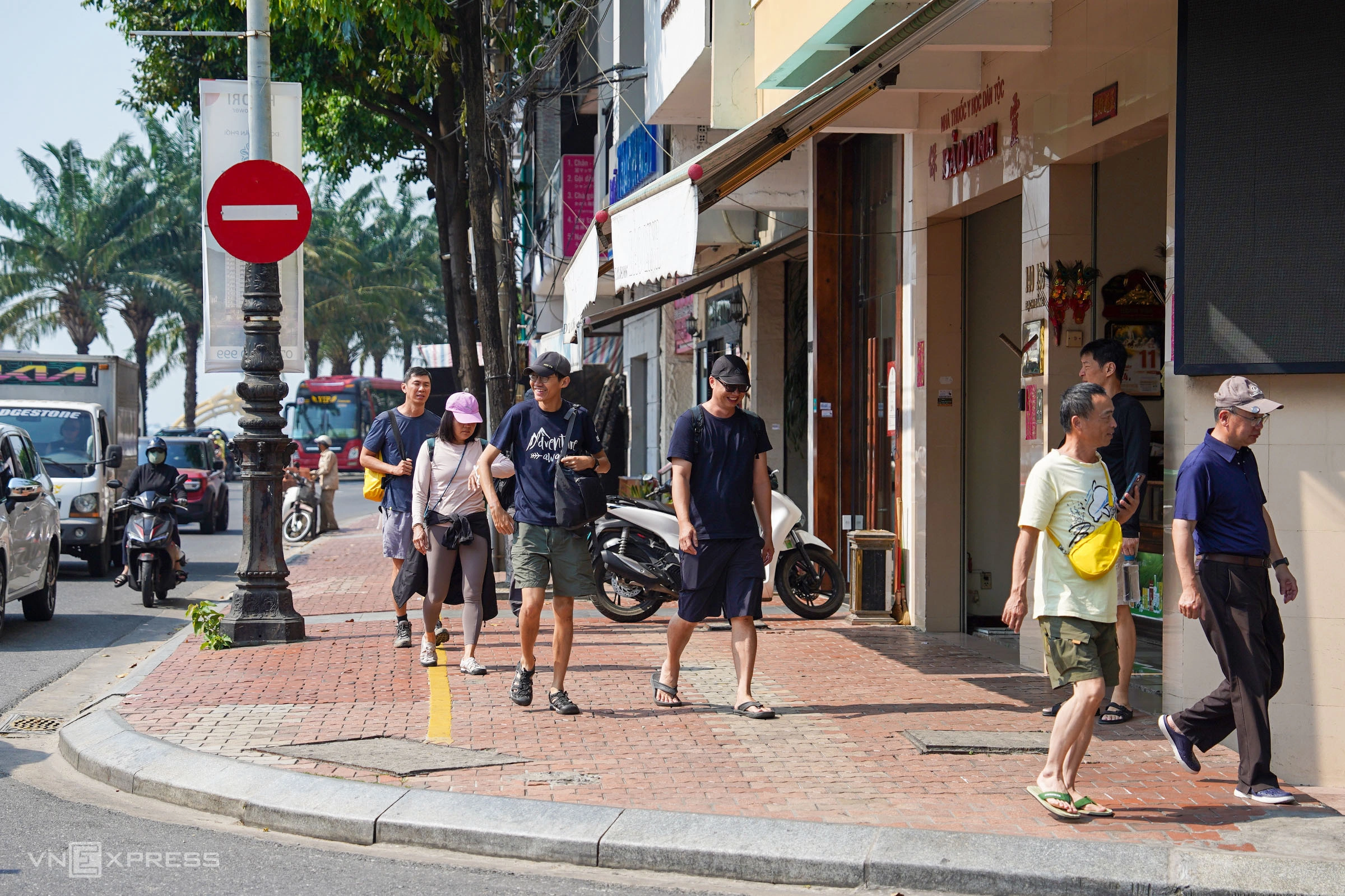 Du khách thoải mái dạo bộ trên vỉa hè đường Bạch Đằng, gần với các dãy nhà mặt tiền kinh doanh buôn bán. Khung cảnh này khác hẳn so với hai tuần trước đây khi nhiều xe máy đỗ lấn tới đường.