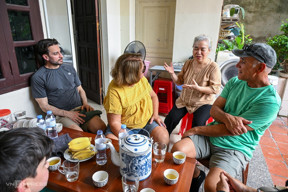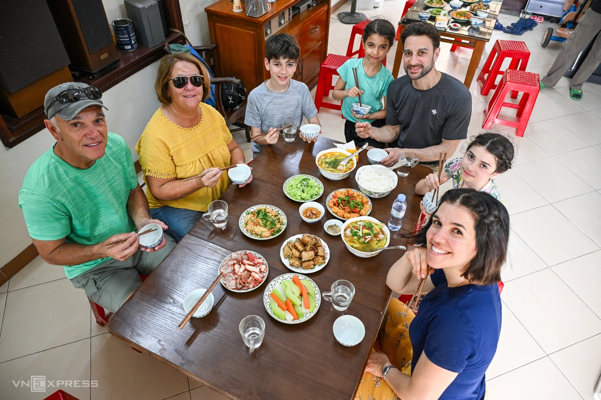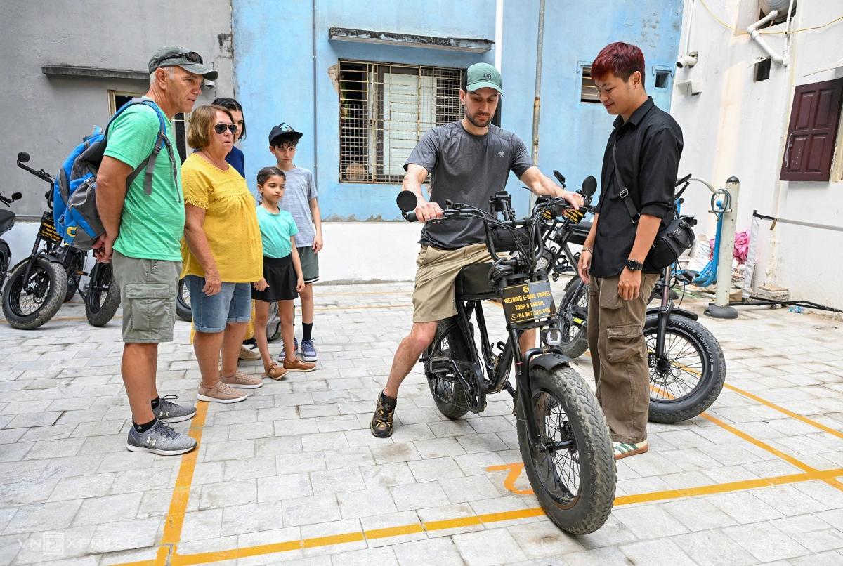 Gia đình Eric Legault (áo xám), du khách Mỹ, gồm 7 thành viên thuộc ba thế hệ đã dành nửa ngày khám phá Hà Nội bằng xe đạp trợ lực trong chuyến du lịch Việt Nam vào đầu tháng 3. Thay vì tham quan theo cách truyền thống, gia đình ông Eric chọn trải nghiệm luồn lách trong các ngõ nhỏ, đi chợ và dùng bữa cùng người dân địa phương.