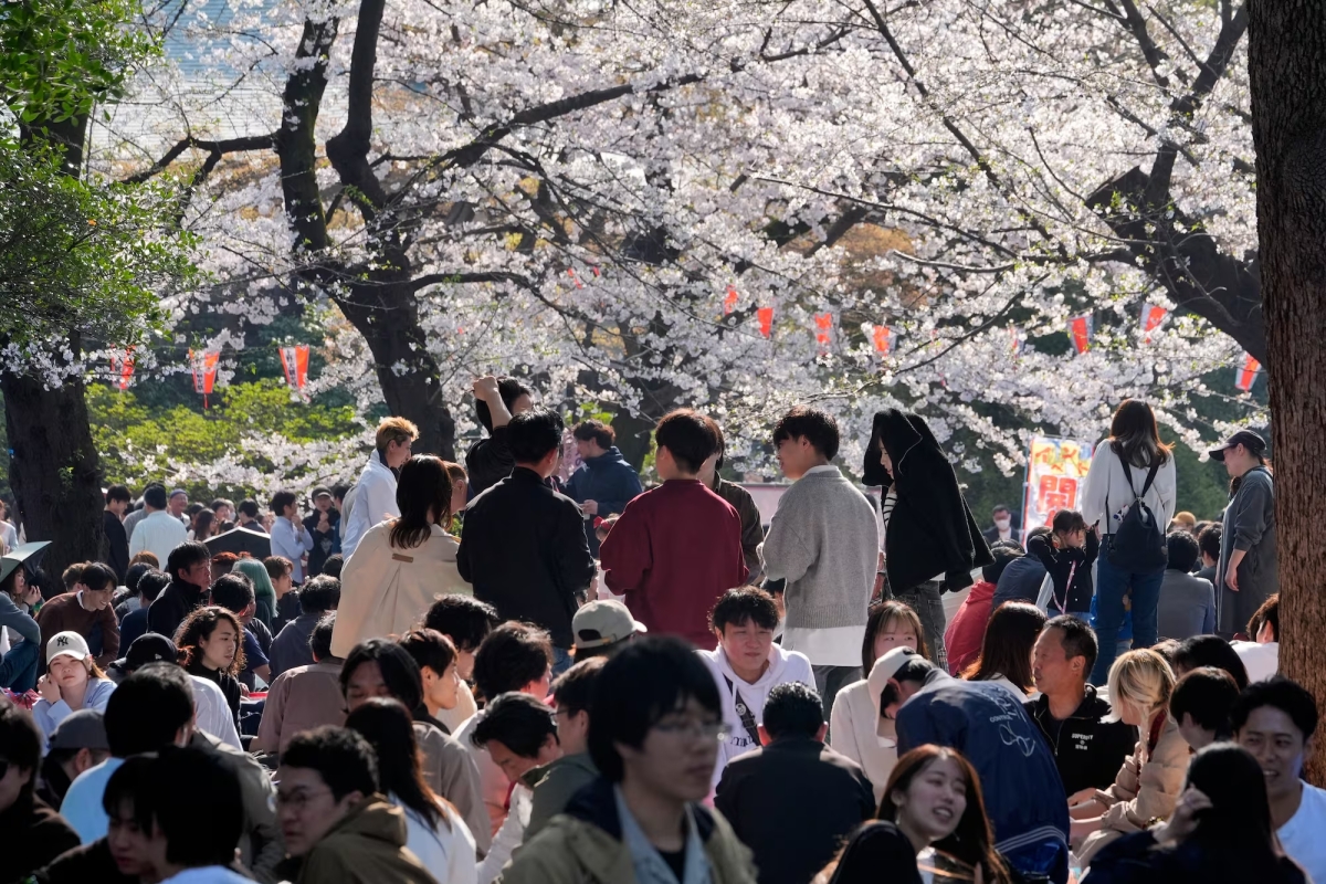 Dòng người ngắm hoa anh đào nở rộ tại khu vực vườn phía Đông (East Garden), thuộc vườn Hoàng cung Tokyo.