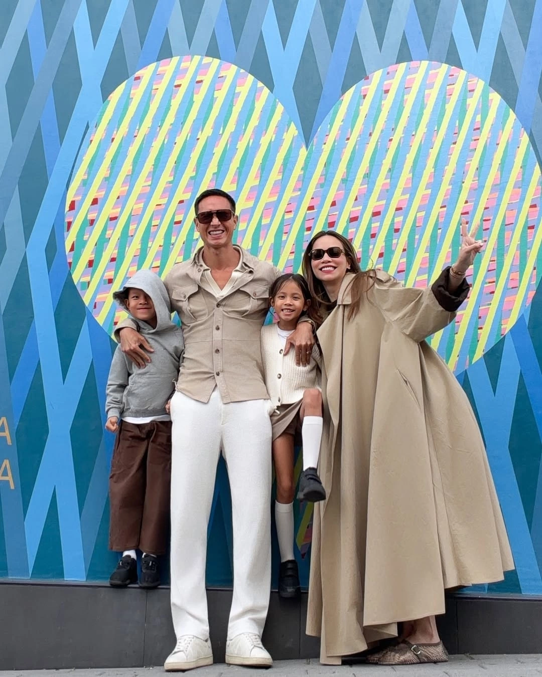 Trong chuyến thăm châu Âu, hai bé được mẹ chọn áo khoác chần bông kiểu dáng unisex. Hồ Ngọc Hà diện váy chữ A tối giản lấy cảm hứng từ thập niên 1960, kết hợp mốt "giày của bố". Kim Lý thể hiện sự thanh lịch bằng bộ quần áo sáng màu, gồm quần chinos cạp cao, sơ mi và áo polo trơn.