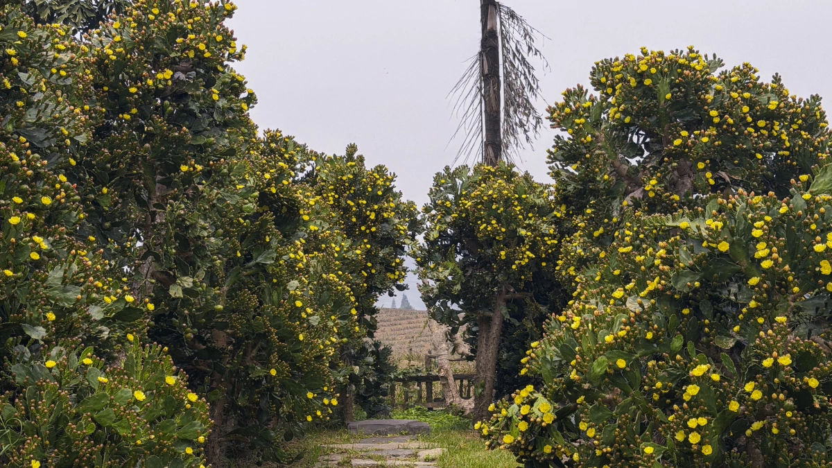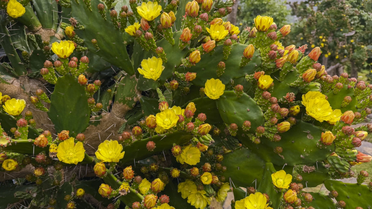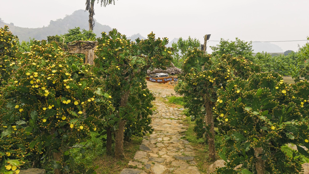 Tại vườn, nhiều cây cao vượt đầu người, thân và gốc lớn, phủ dày gai. Khi vào mùa, hoa nở đồng loạt, sắc vàng rực rỡ. Hoa thường bung vào buổi sáng và khép dần khi về chiều.