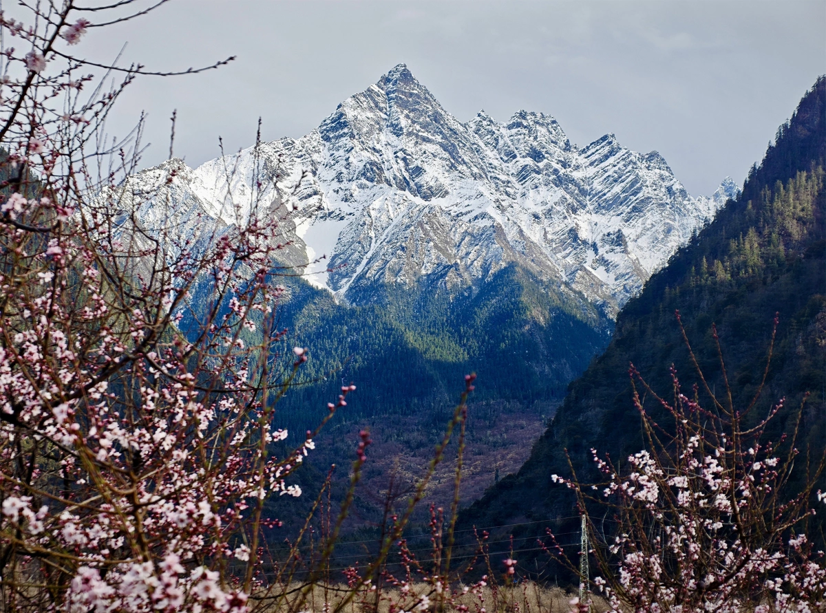Tây Tạng đang là mùa xuân, nhiều loài hoa nở bung nở khắp nơi như anh đào, mơ, cải, trong đó, hoa anh đào nhiều và nổi bật nhất.