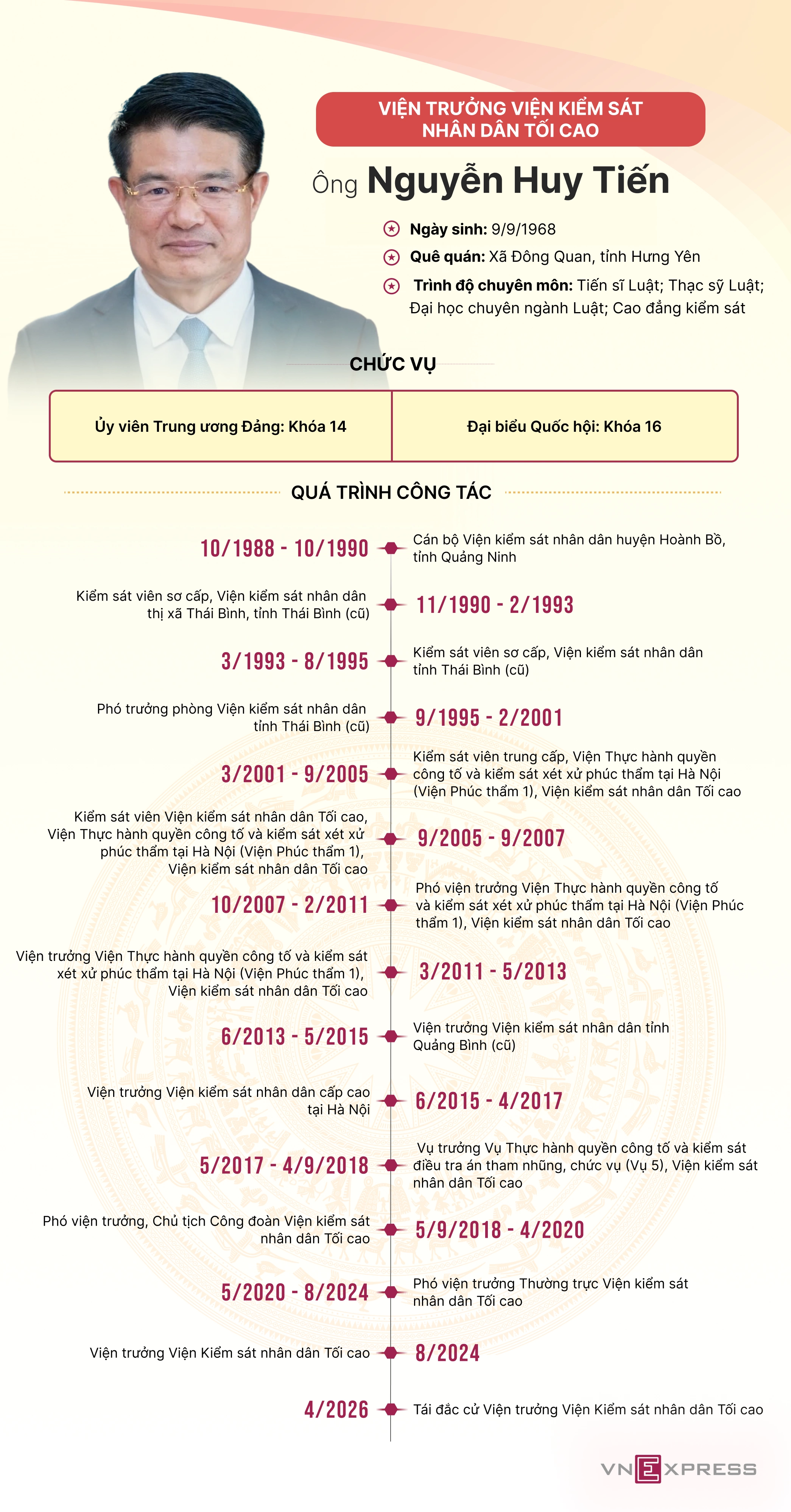 Ông Nguyễn Huy Tiến có nhiều năm công tác trong ngành kiểm sát,ểusửViệntrưởngViệnkiểmsátnhândânTốicaoNguyễnHuyTiếsocolive fan từng kinh qua nhiều vị trí từ địa phương đến trung ương trước khi giữ chức Viện trưởng Viện kiểm sát nhân dân Tối cao.