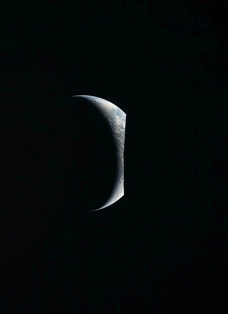 Trong ảnh chụp bằng ống kính 400 mm, Trái Đất có hình lưỡi liềm mỏng, chỉ phần rìa trên được chiếu sáng, màu xanh lam nhạt và những đám mây trắng rải rác nổi bật trên nền vũ trụ tối đen.