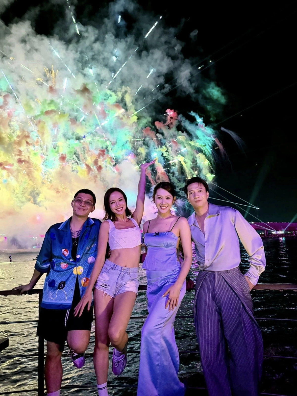 Thúy Ngân (thứ hai từ phải sang) tụ họp cùng hội bạn thân là S.T Sơn Thạch (phải) và vợ chồng Ngọc Anh - Cường Seven, hôm 8/3 tại Phú Quốc.