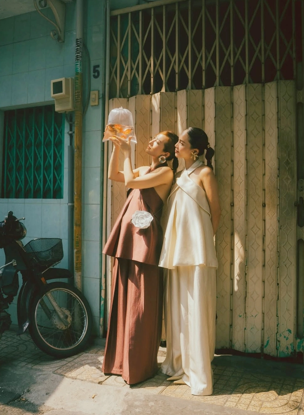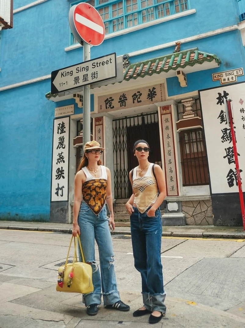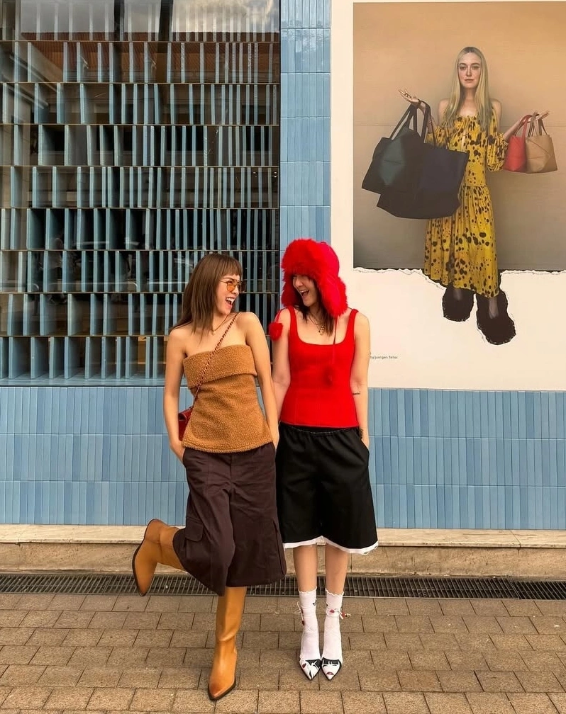 Trước đó vài ngày, cả hai mặc bộ áo yếm giống nhau, chỉ khác màu. Họ để tóc đuôi ngựa, đeo trang sức bản lớn theo phong cách thập niên 1980.