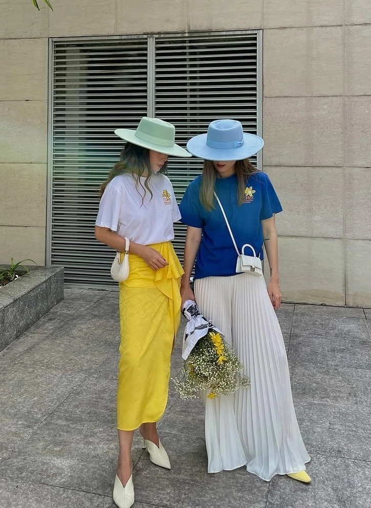 Cùng phối áo phông, chân váy, mũ rộng vành và dép cao gót nhưng cả hai vẫn tạo được nét riêng. Yến Trang chọn chân váy bất đối xứng dáng tulip. Yến Nhi diện váy maxi chữ A dài quét đất.