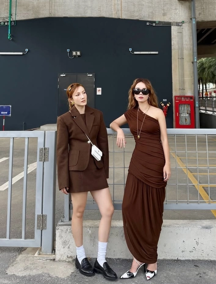Cả hai theo đuổi mốt màu nâu hot nhất năm 2025. Yến Nhi thể hiện phong cách với váy suit công sở, tạo phóng khoáng bằng giày loafer và tất trắng. Yến Trang hóa quý cô với đầm bất đối xứng xếp nếp theo phong cách Hy Lạp.