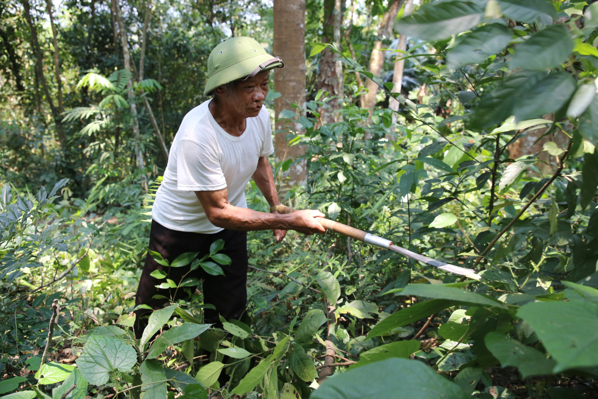 Ông Đô chặt tỉa từng cây bụi trong rừng giúp cây lim vươn lên. Hơn 30 năm qua, thường xuyên qua lại trong rừng, ông nhớ từng vị trí cây lim. "Nhiều lần bắt gặp người dân chặt củi, tôi nhắc họ không được chặt cây sống, còn muốn lấy củi thì chặt những cây khô", ông kể.