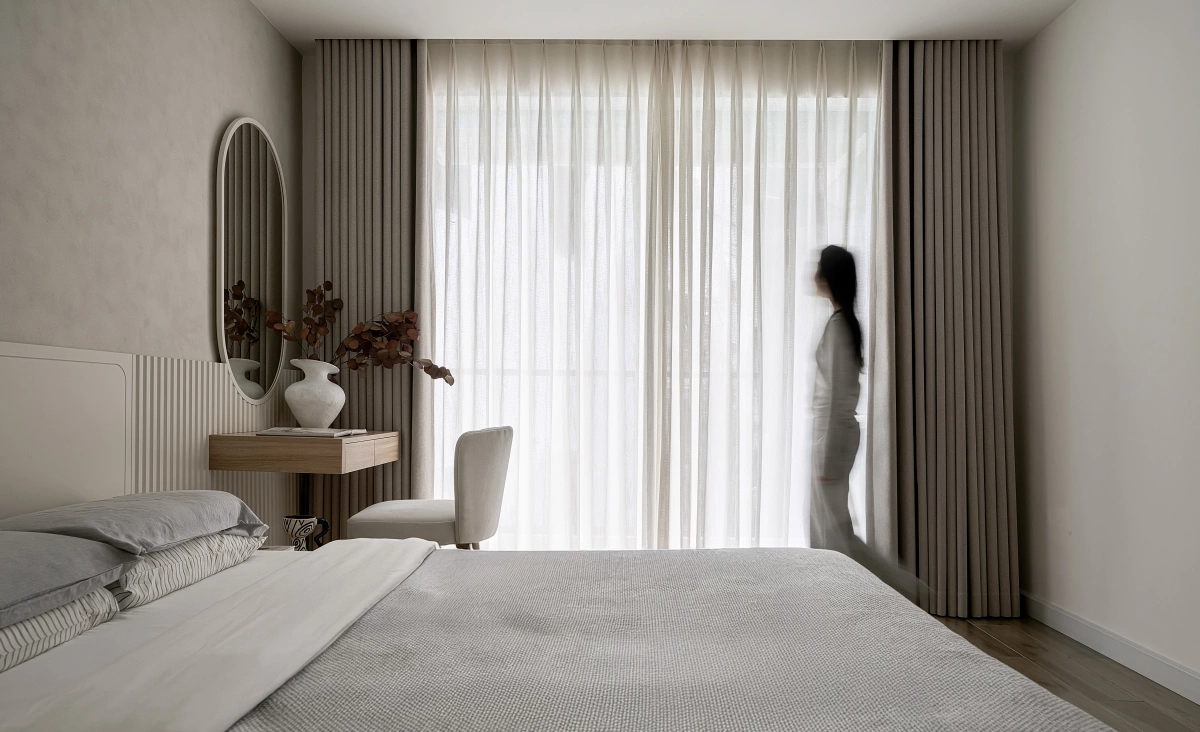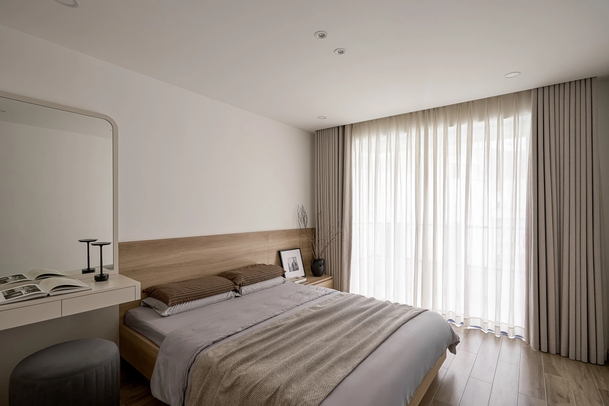 Phòng ngủ được thiết kế với đầu giường ốp gỗ, rèm voan xuyên sáng kết hợp rèm dày chắn sáng.