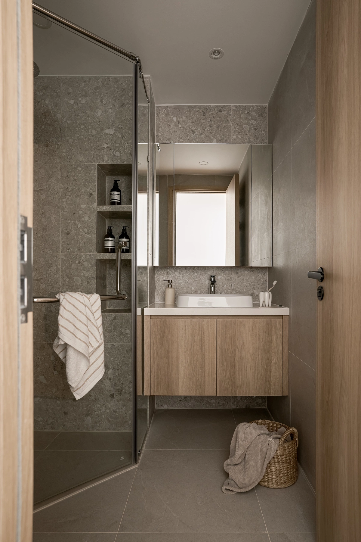 Phòng tắm ốp gạch terrazzo xám, kết hợp tủ lavabo gỗ và gương hộp.