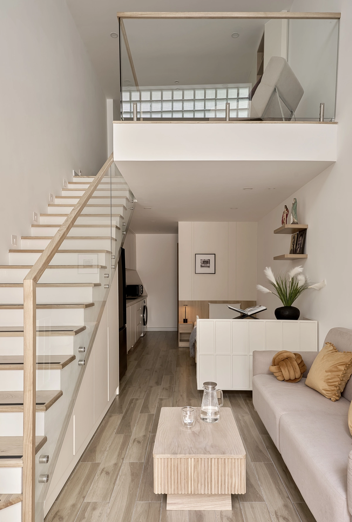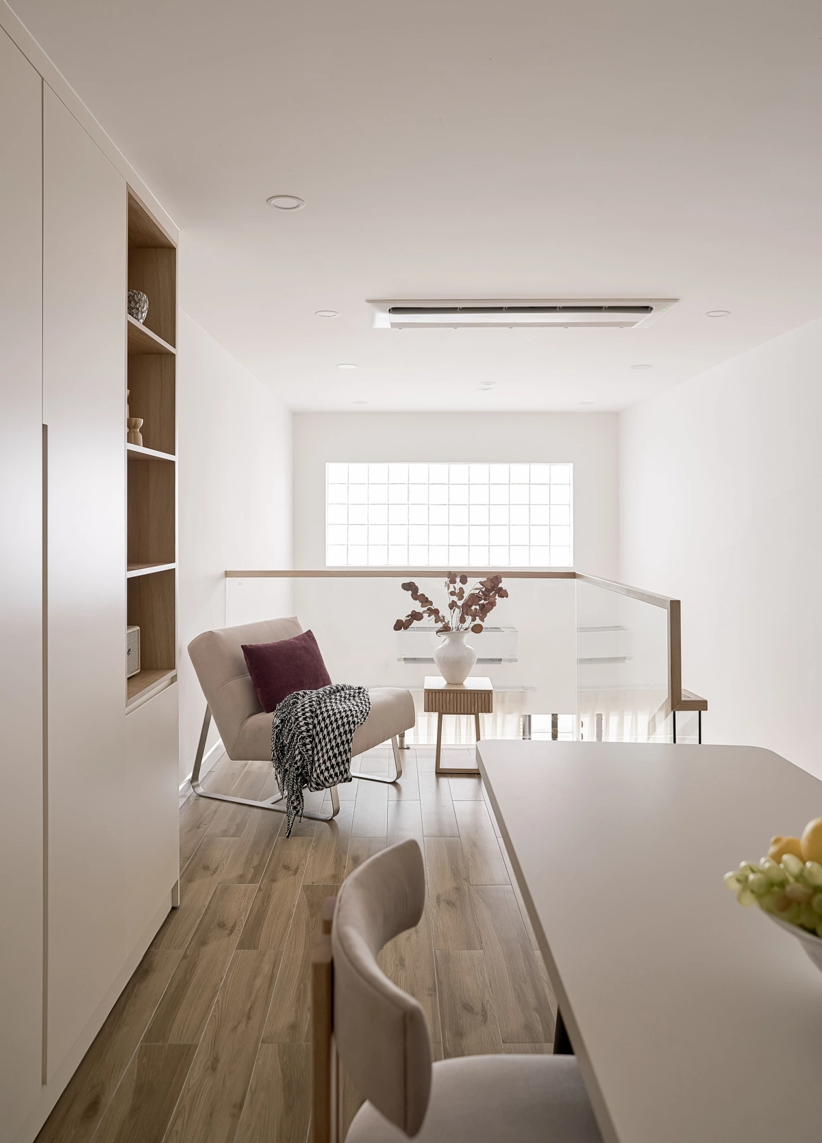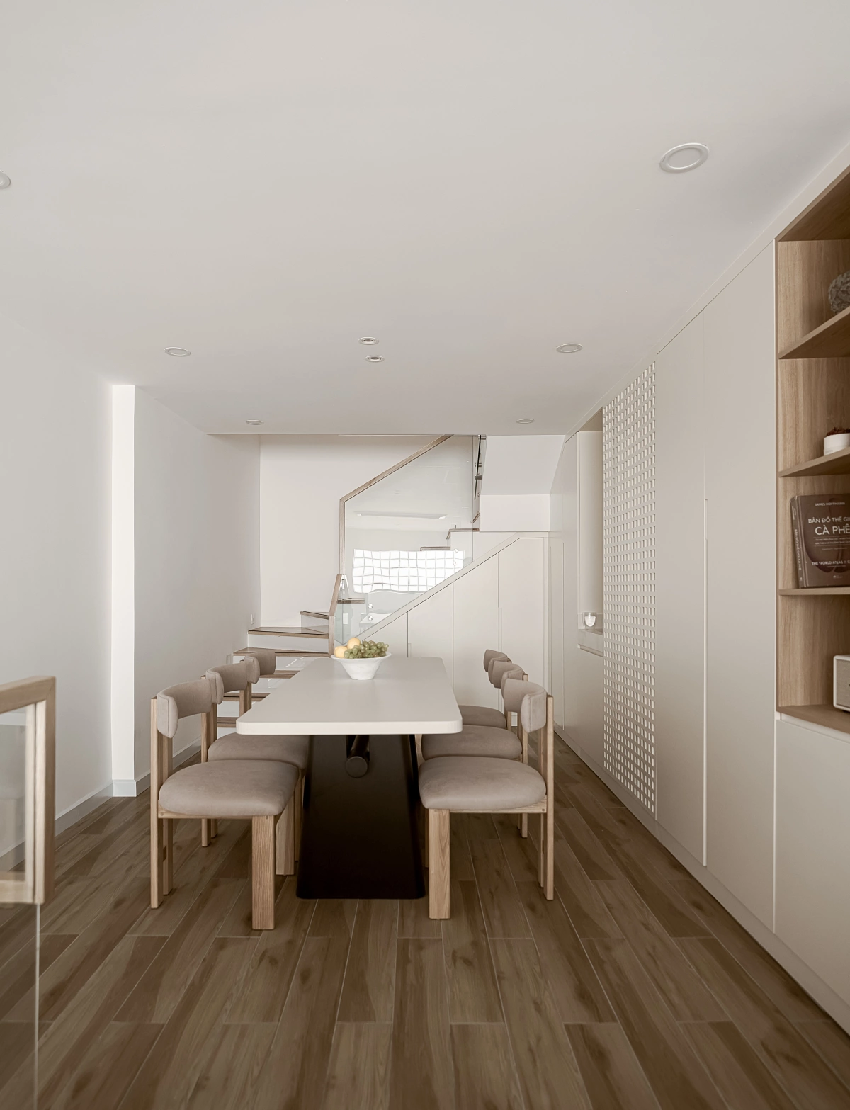 Toàn bộ nội thất của căn nhà được thiết kế theo ngôn ngữ Japandi với bảng màu trung tính chủ đạo gồm trắng ngà, be và gỗ sáng. Mọi đường nét nội thất được xử lý tối giản, dứt khoát, không có chi tiết trang trí thừa.