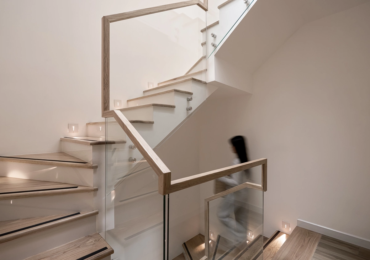 Cầu thang gỗ sáng màu kết hợp tay vịn gỗ và vách kính trong suốt tạo cảm giác nhẹ nhàng, mở rộng thị giác.