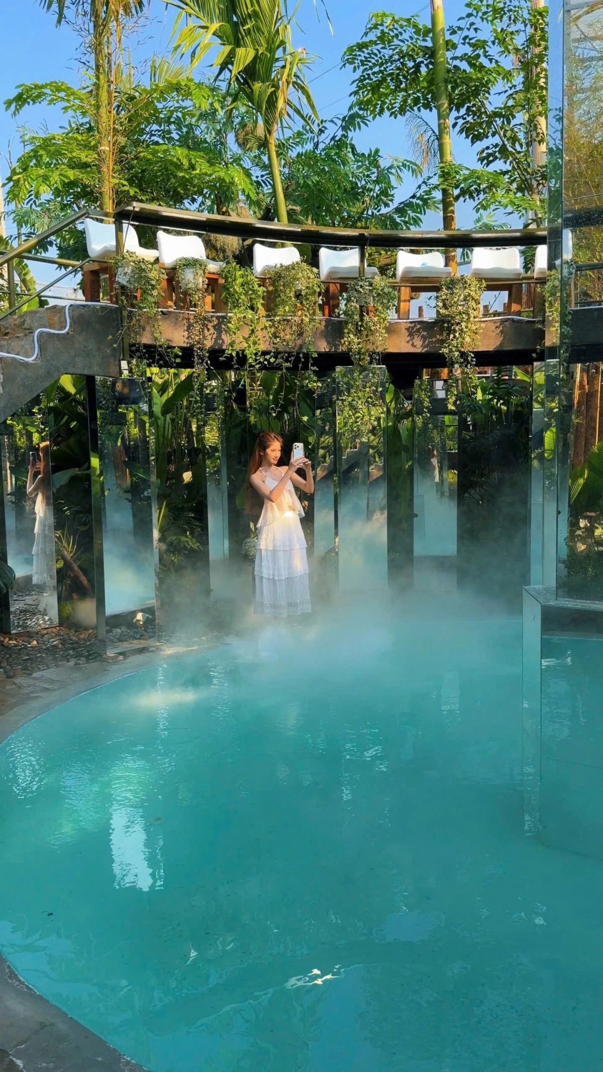 Tại mê cung gương du khách có thể dạo quanh hồ hoặc di chuyển theo lối cầu thang được bố trí như khán đài, hướng tầm nhìn xuống toàn bộ khu vườn, thuận tiện tìm kiếm những góc chụp đẹp.