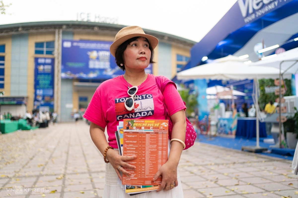 Bà Đỗ Bích Hiền (mũ hồng), ở Hà Nội, cho biết đang tìm hiểu giá và cam kết dịch vụ của các công ty. Bà chuyên đi tour, đã du lịch hầu hết quốc gia phổ biến ở châu Á, dự tính quay lại Nhật Bản hoặc Hàn Quốc trong thời gian tới.